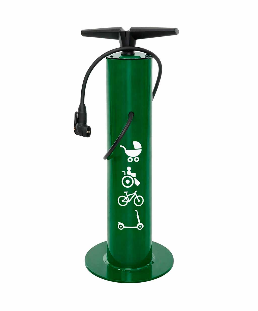 Estación urbana para el inflado de ruedas de bicicletas, patinetes y cochecitos,  diseñada para espacios públicos y privados.