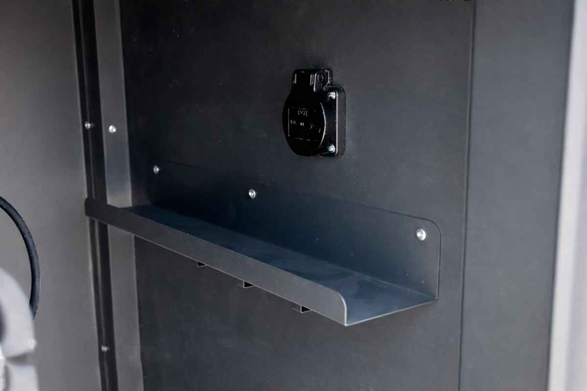 En su interior, cada compartimento principal incorpora un soporte específico para patinete, que permite mantenerlo correctamente sujeto y estable durante el estacionamiento. El box puede configurarse como solución para patinetes convencionales o como box para patinetes eléctricos, incorporando opcionalmente tomas de corriente para la carga y un estante interior para alojar el cargador.