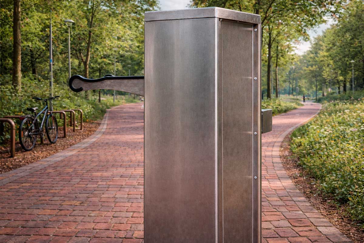 La estación es totalmente personalizable bajo pedido: se puede adaptar el color (paleta RAL) y añadir marca o logotipo, convirtiéndola en un punto de servicio funcional y también en un elemento de imagen corporativa o señalización urbana.