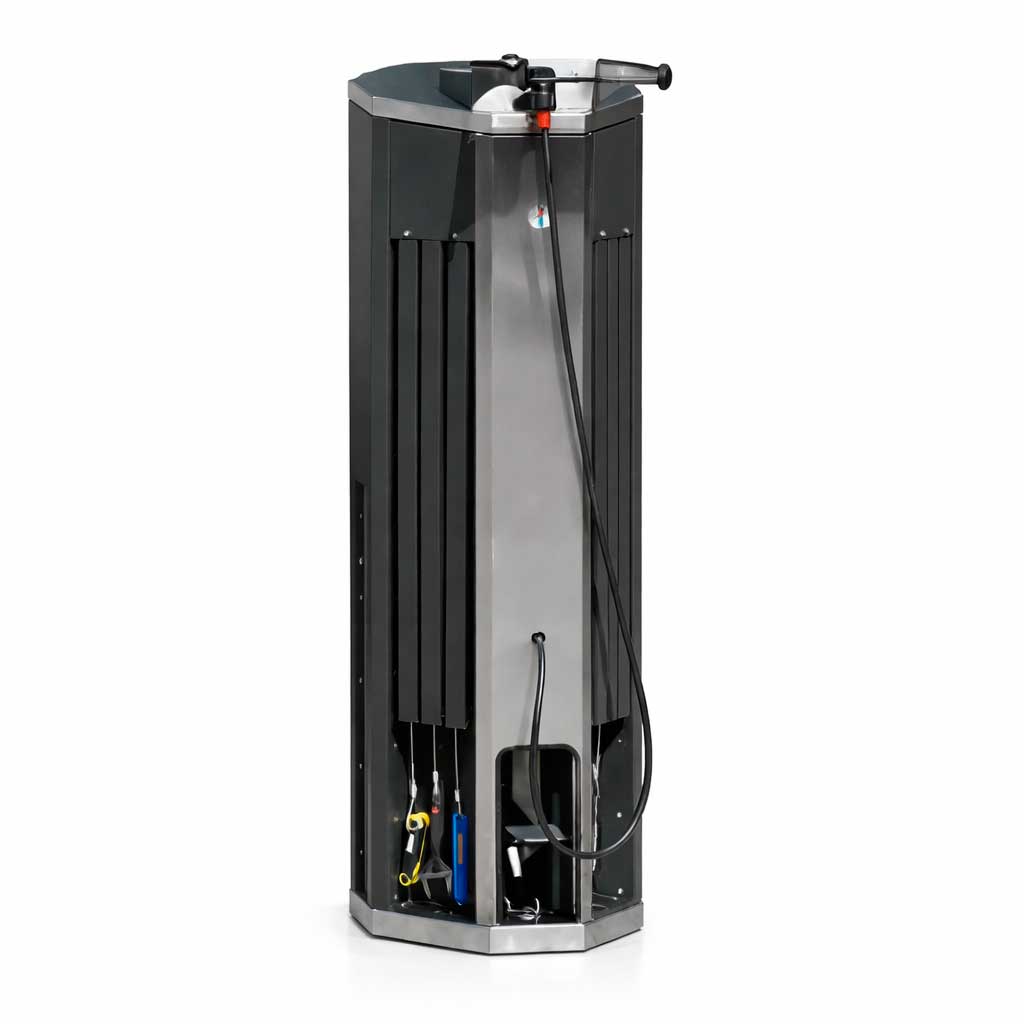 Fabricada en acero galvanizado con recubrimiento en polvo y peana de acero inoxidable, incluye kit completo de herramientas de acero inoxidable, bomba de inflado con accionamiento mediante pedal (pedal frontal inferior) y manómetro frontal para controlar la presión con precisión.