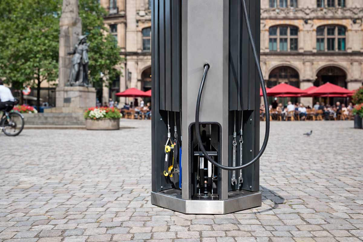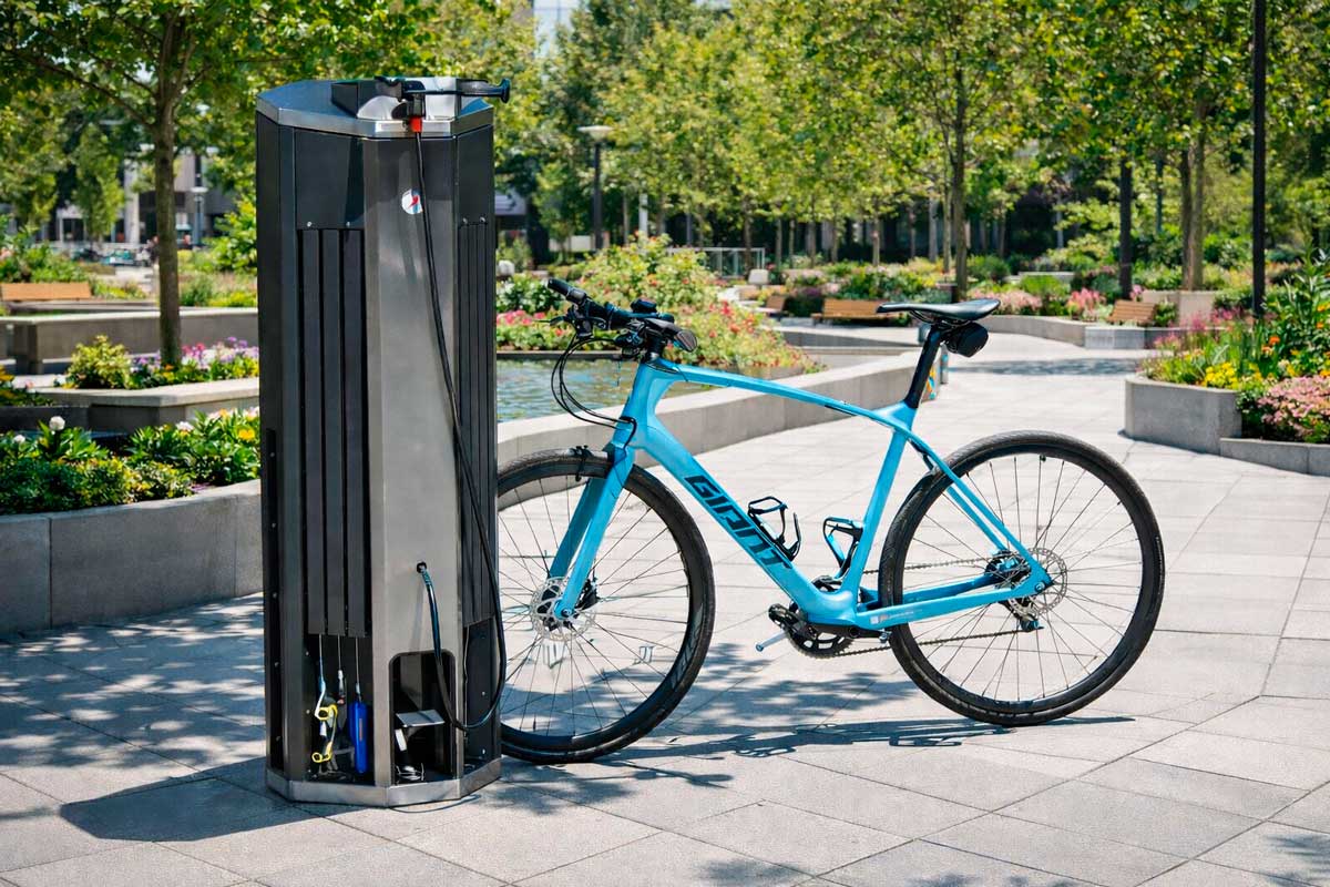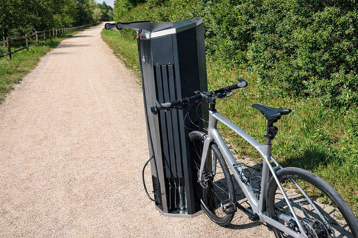 Estación urbana de reparación e inflado para bicicletas con estructura en prisma octogonal, diseñada para ofrecer mantenimiento rápido y seguro en espacios públicos y privados.