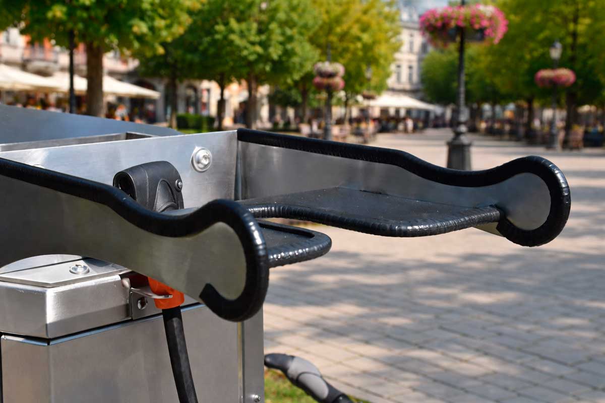 La estación es totalmente personalizable bajo pedido: se puede adaptar el color (paleta RAL) y añadir marca o logotipo, convirtiéndola en un punto de servicio funcional y también en un elemento de imagen corporativa o señalización urbana.