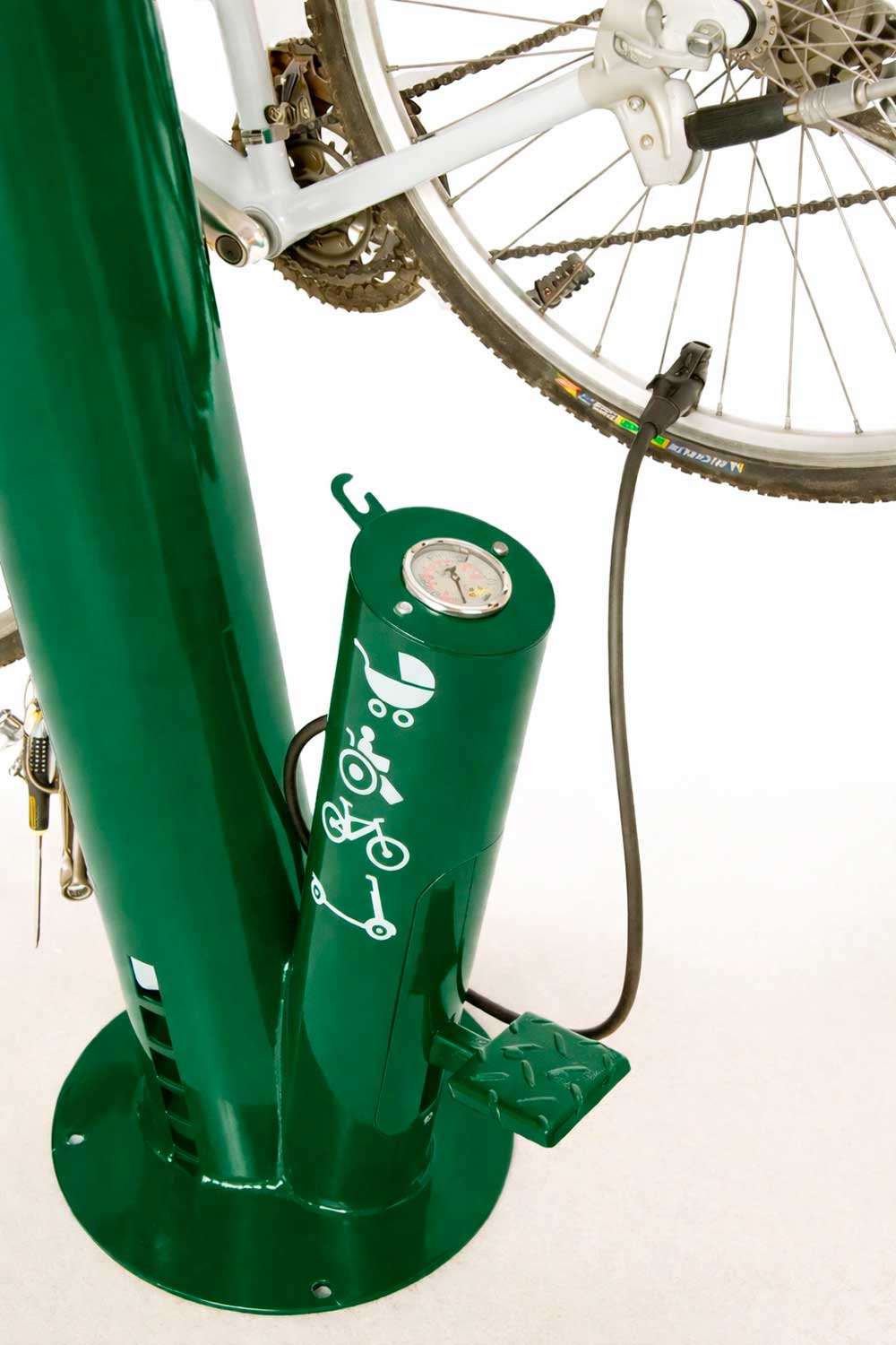 Estación de reparación de bicicletas autoservicio con bomba de pie