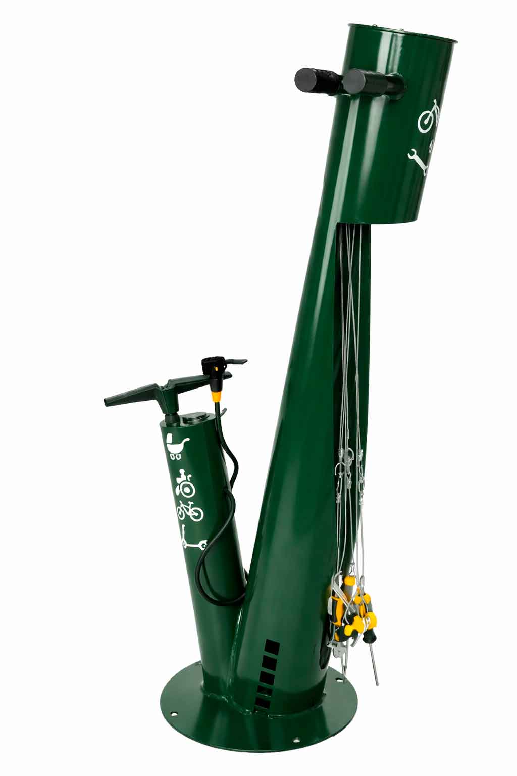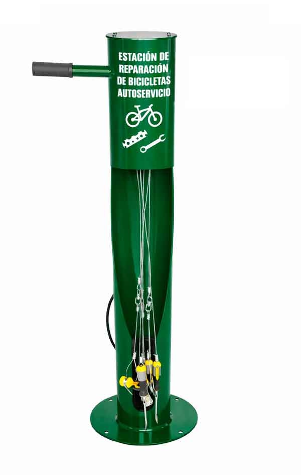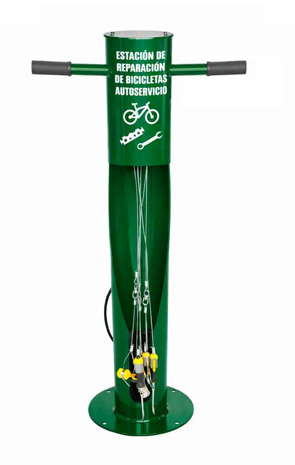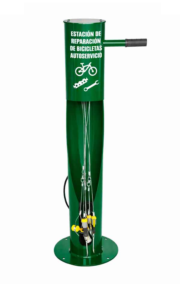 La estación CES-BM incluye herramientas esenciales para el mantenimiento básico de todo tipo de bicicletas. Sus herramientas van sujetas mediante cables de acero inoxidable, diseñados para soportar el uso intensivo en instalaciones públicas.